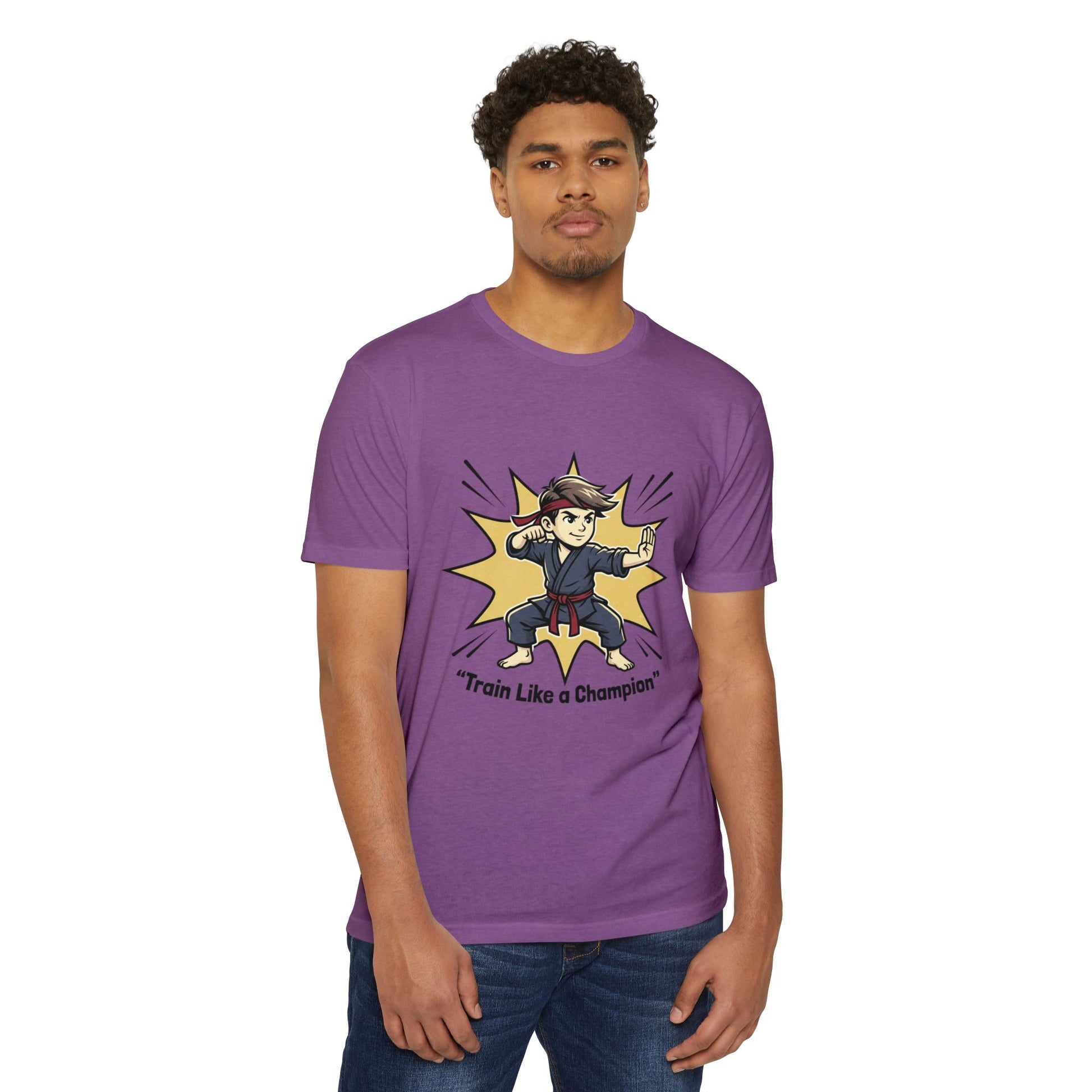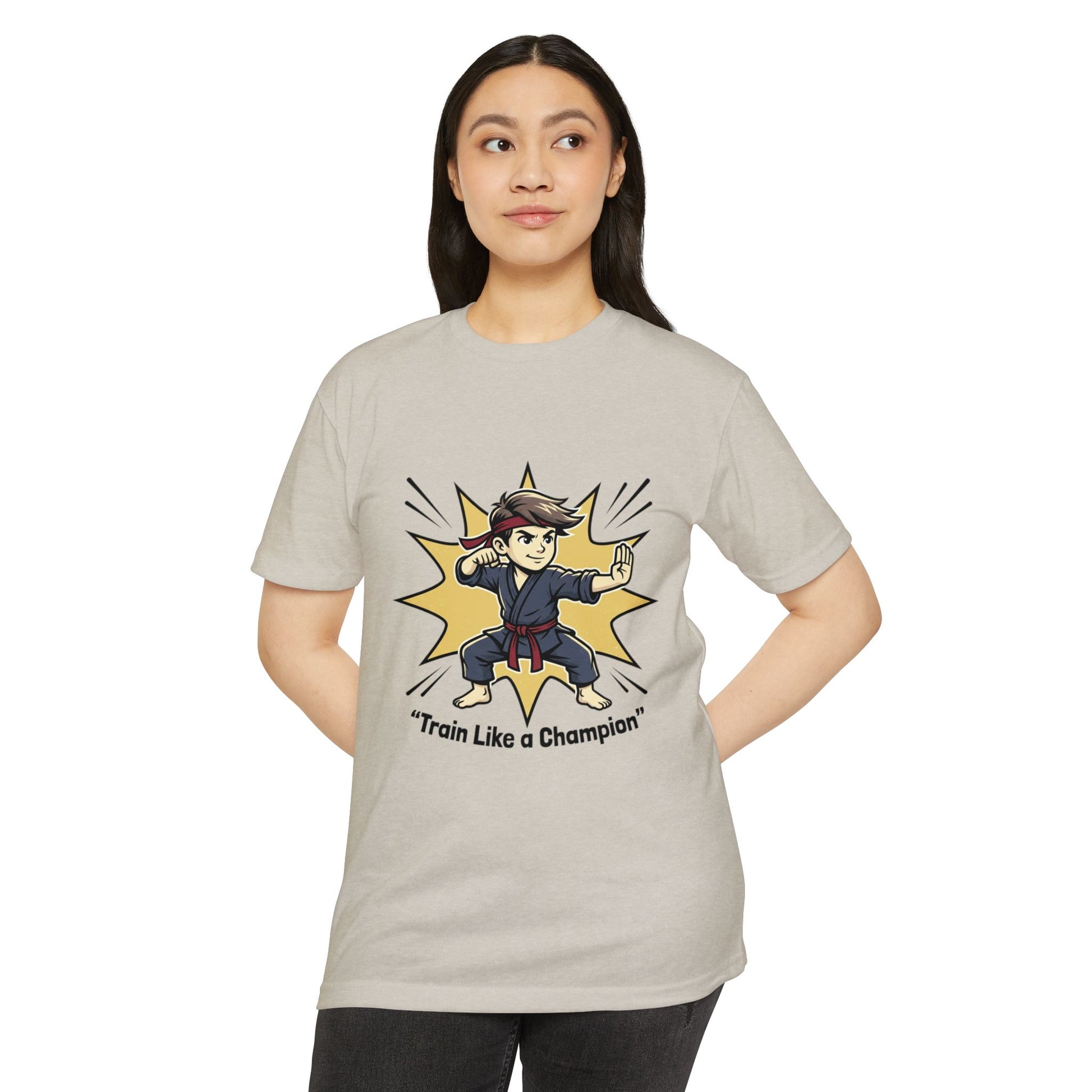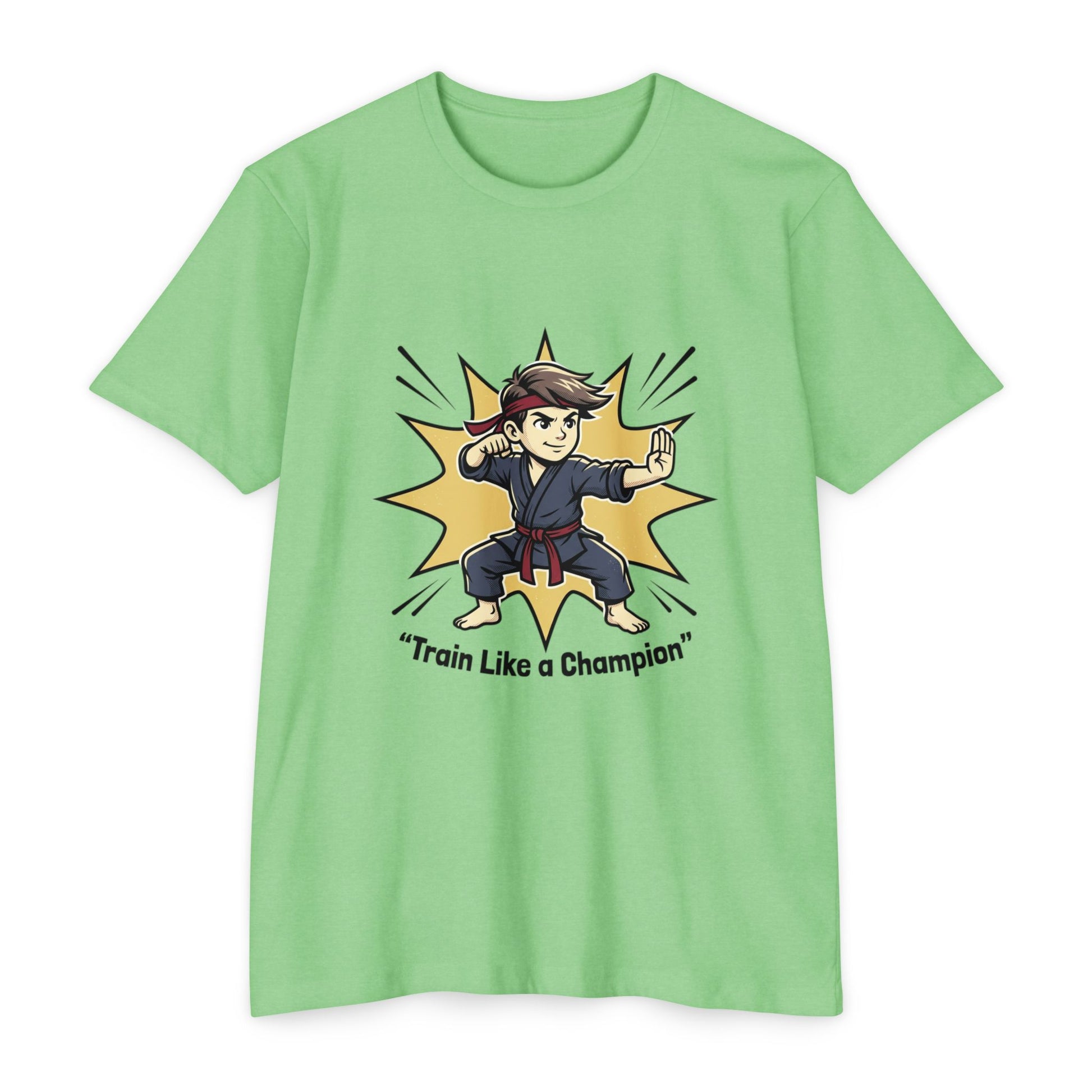 Soft, light, and ready for movement — this tee celebrates the drive to train harder and stand taller. A lively martial-arts illustration bursts from the chest: a focused young fighter in mid-form, framed by a comic-style impact star and the uplifting line “Train Like a Champion.” The design feels energetic without being loud, pairing perfectly with the tee’s subtly heathered base color. Wear it to training sessions, warm-ups, or on days when you want a quiet reminder to show up and push your limits. The comfortable fabric stretches with you during practice and settles back into a neat fit afterward, keeping the shirt feeling fresh session after session.